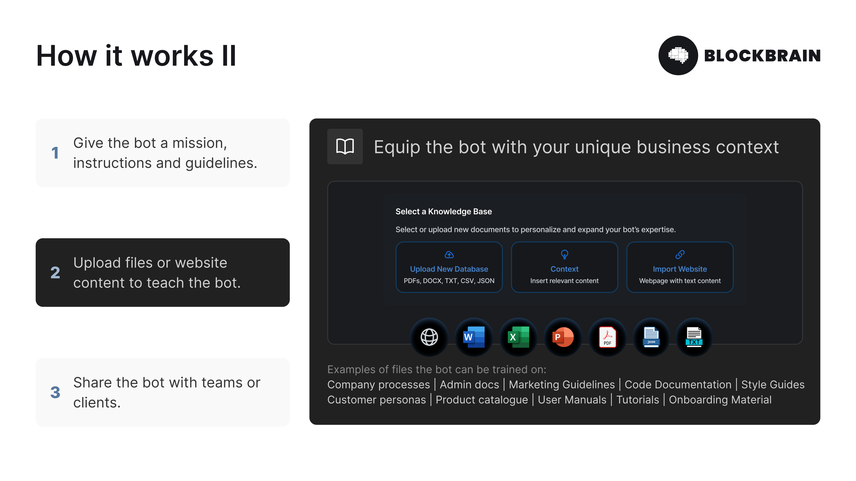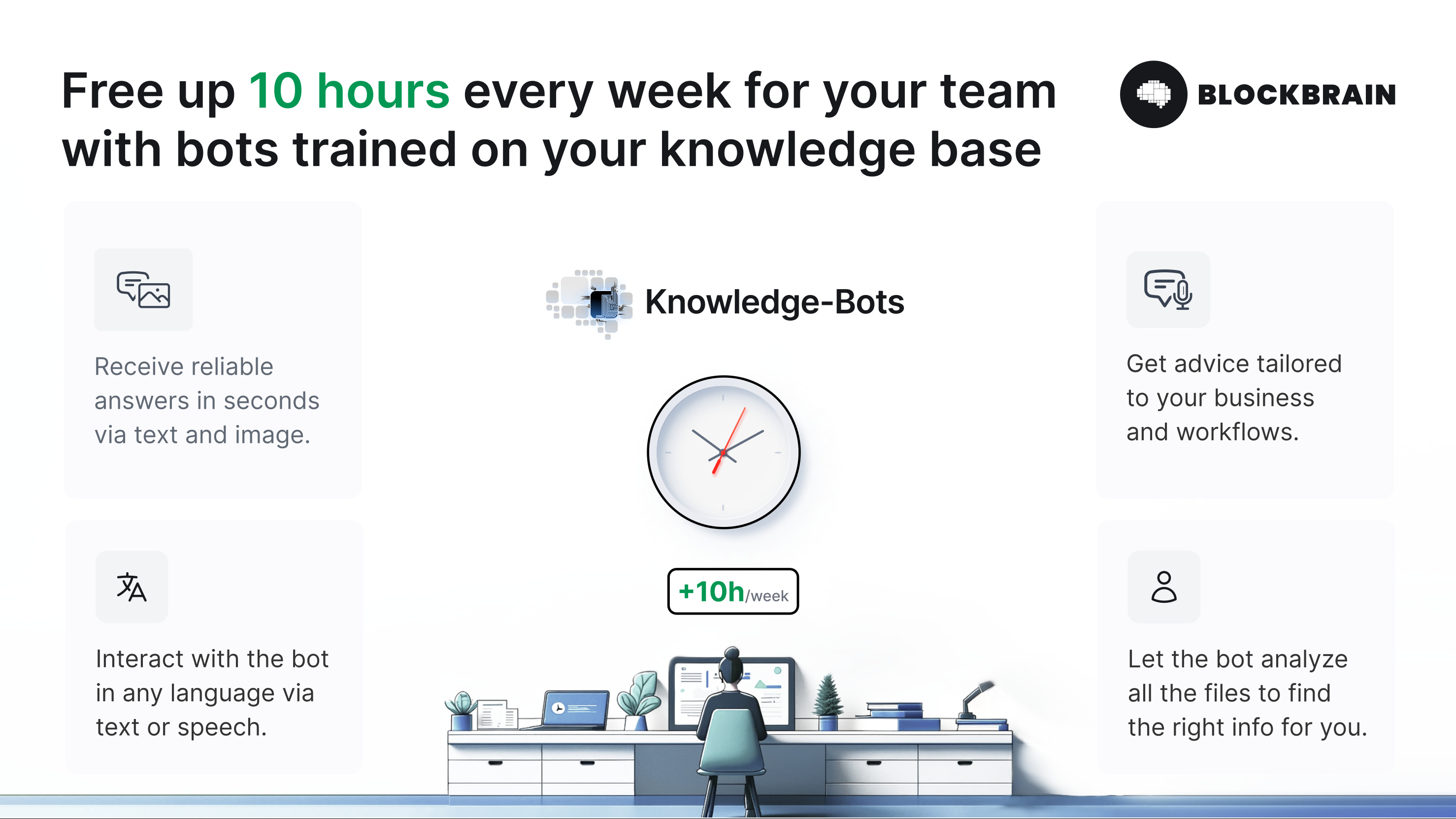 Knowledge Bots are personalized AI assistants trained on your unique business context and company documents. Imagine having a super intelligent colleague with perfect memory who can retrieve and synthesize information from thousands of documents in seconds. Available 24/7, in any language.
