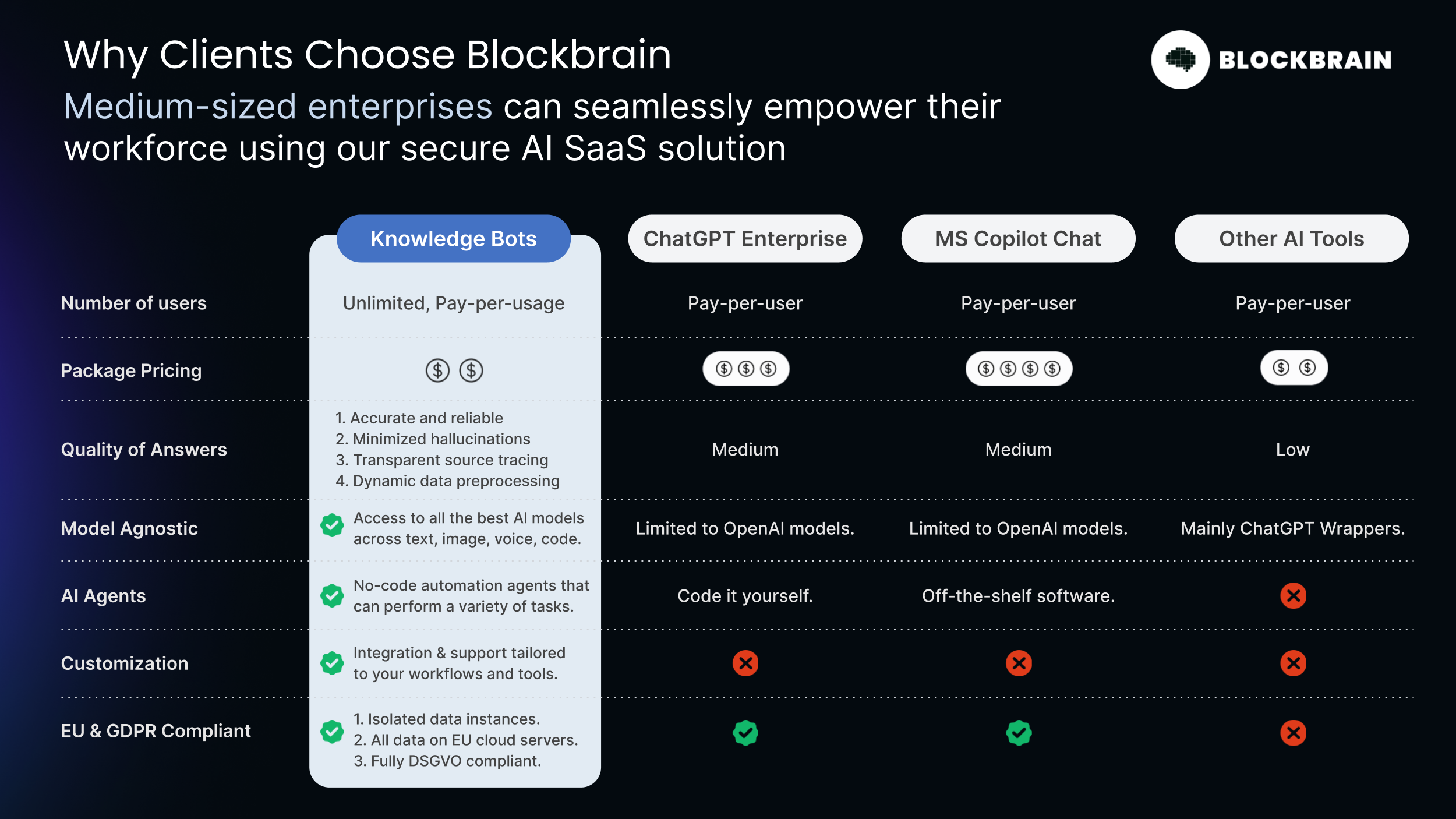 Blockbrain is already helping numerous companies across Germany and Europe to gain an edge in the AI revolution. On top of being data secure & GDPR compliant, the pricing model is also much more suitable for medium-sized and large-sized enterprises than tools like ChatGPT or Microsoft by having usage-based pricing instead of paying $30+ for every user.