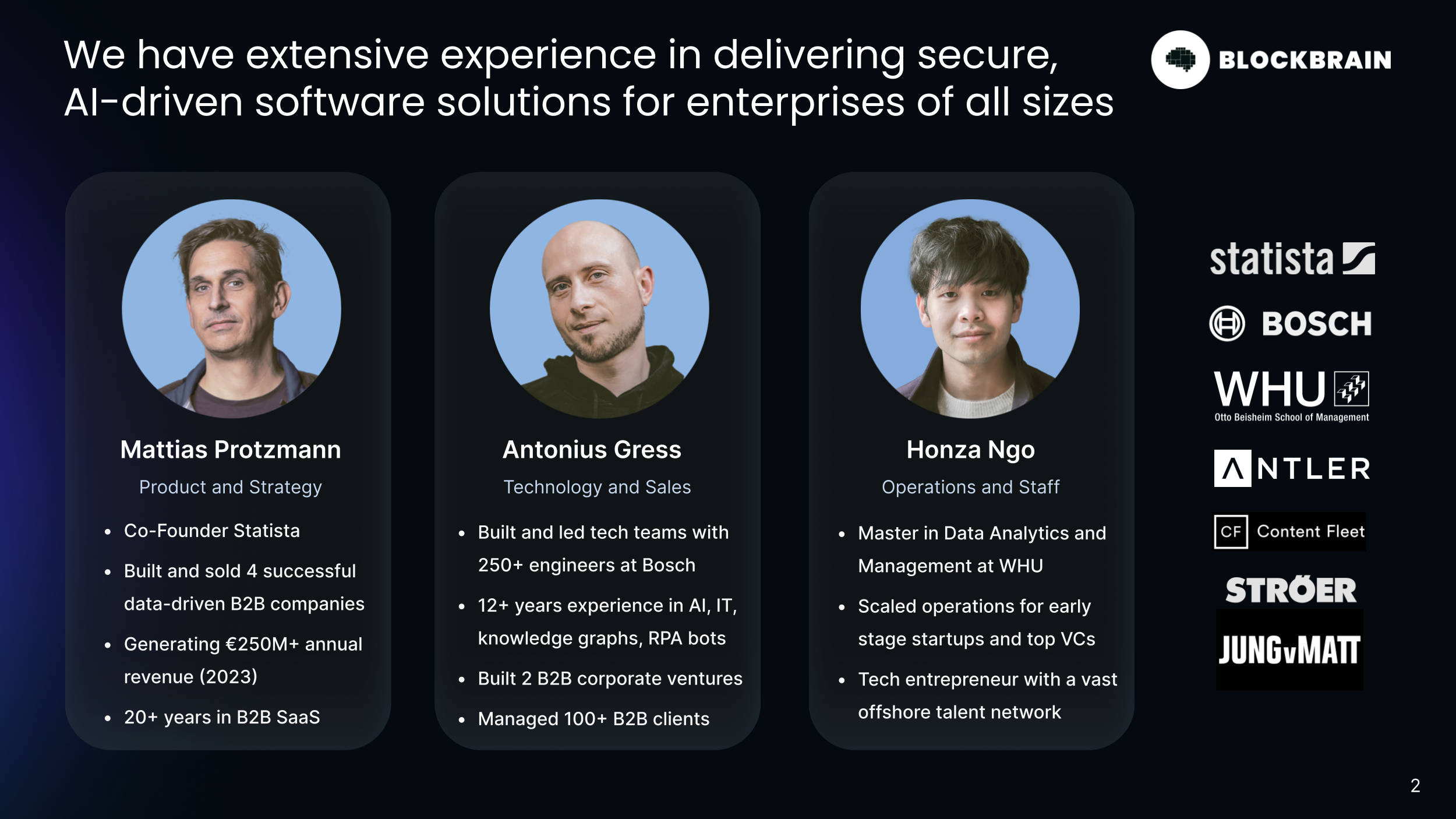 Blockbrain's founding team, with 50+ years of combined experience in enterprise software, AI, automation, and data security, includes the co-founder of Statista - Mattias Protzmann and the tech executive who led the automation and AI unit at Bosch - Antonius Gress.