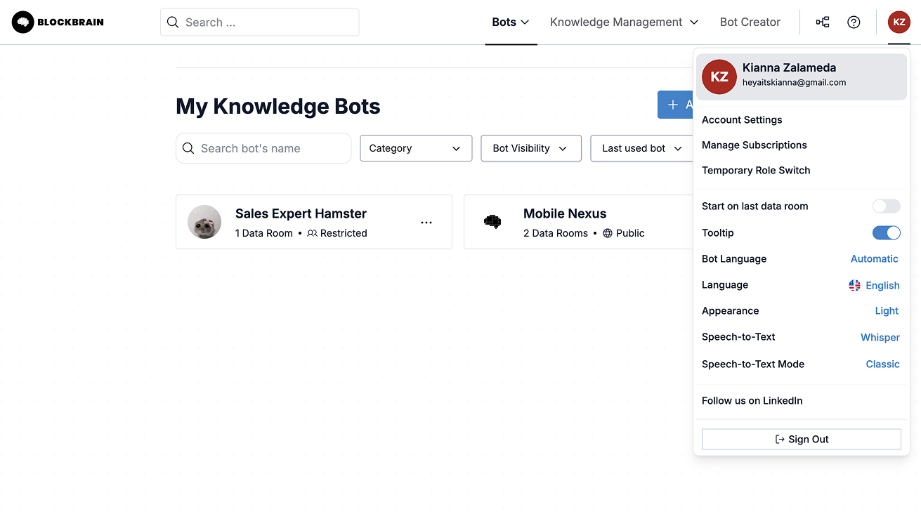 You can display the Knowledge-Bots Platform interface in either German or English.