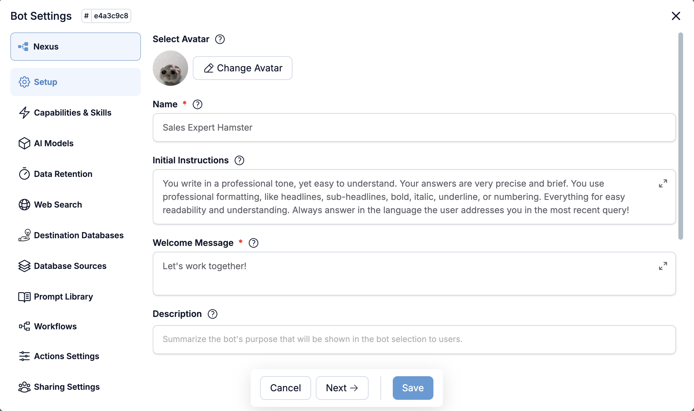 Setup: Customize the bot’s avatar photo, name, tone, and welcome message. You can also set: