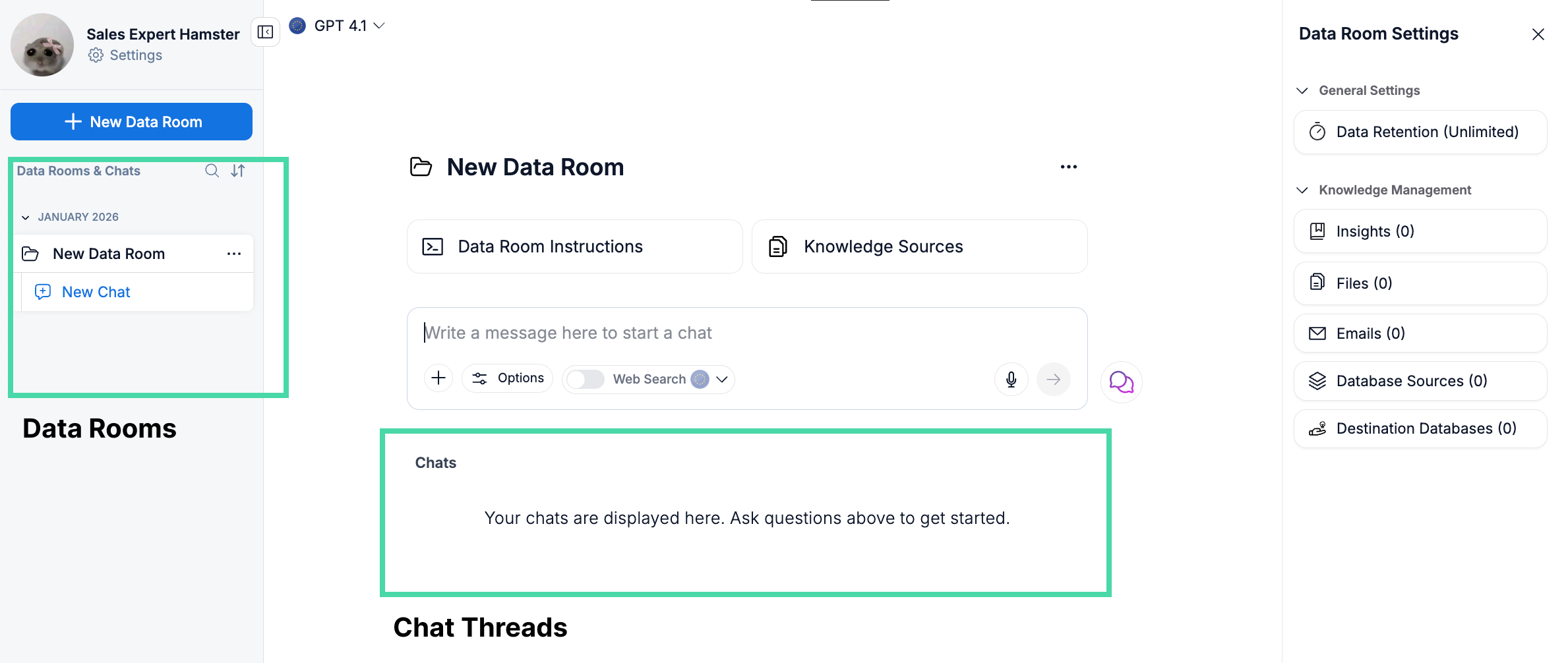 Chat Rooms. Multiple chat threads under one workspace, all inheriting the same Data Room context by default.