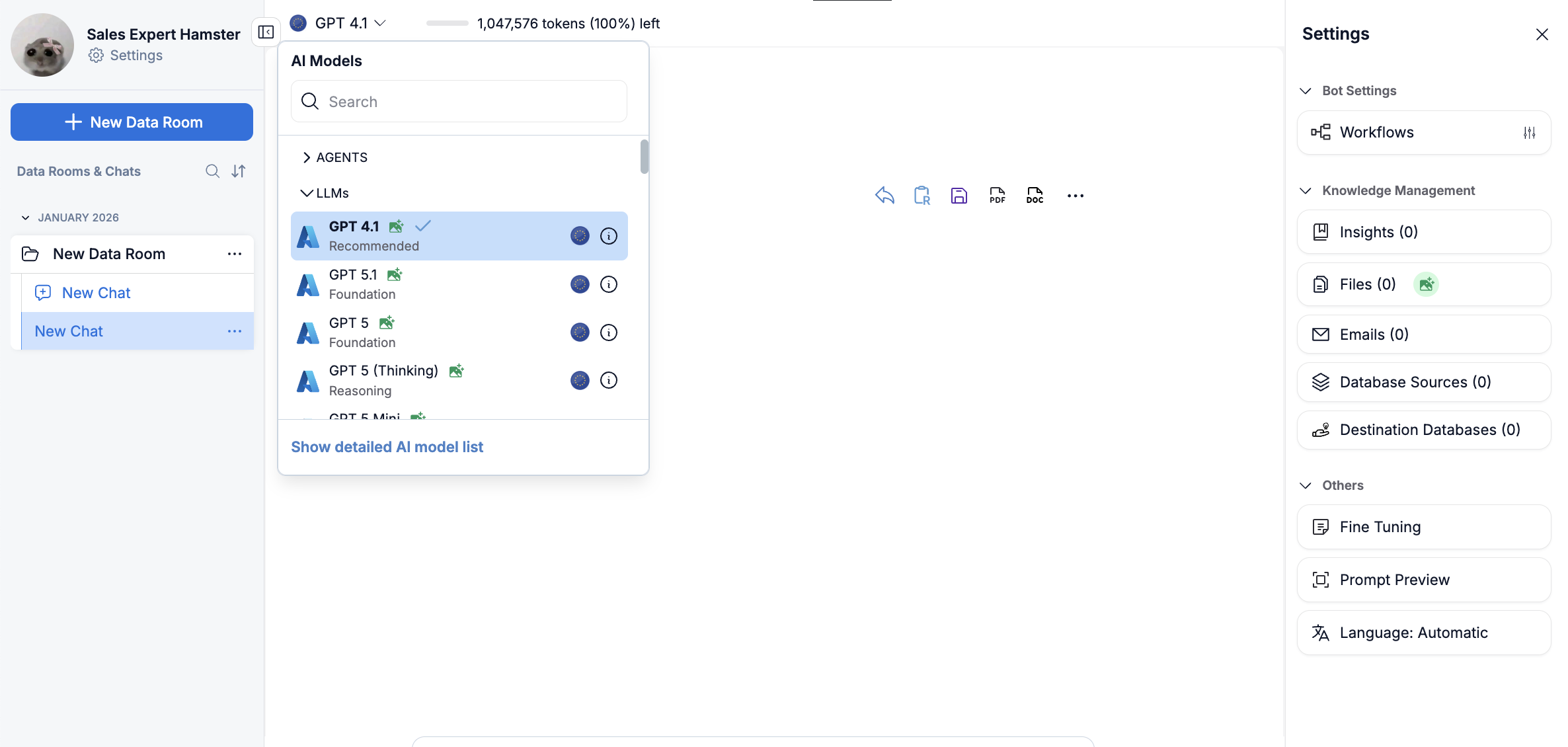 Select the AI Model (LLM): Choose the language model (e.g., GPT, Gemini, Claude) that best aligns with the specific needs of the data room. For example, you might prefer a model that excels at handling long documents, supports advanced coding tasks, or performs well with multi-step prompts used in workflows.
